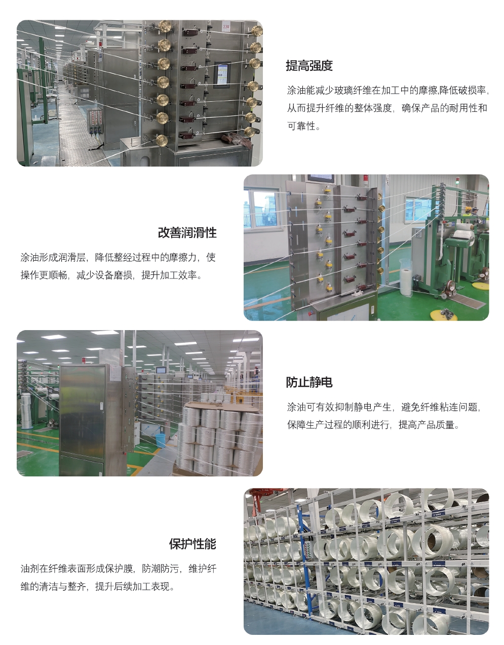 涂油柜是玻璃纤维生产线中的一种设备,主要用于对纱线进行涂油处理。涂油柜通常由涂油槽、输送系统、涂油辊和控制系统等组成,其作用是在纱线表面形成一层薄膜,提高纱线的柔软性和润滑性,减少纱线之间的摩擦和断裂。